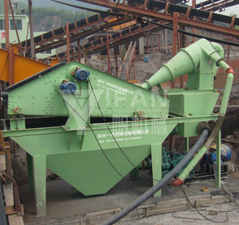 The system is composed of motor、pump、Cyclone、vibrating screen、Pool、Recycling Box. Work procedure: The compound of sand and water is transported to cyclone,the sand that centrifugal classification concentrate provided to the vibrating screen by the heavy grit, sand and water are effectively separate after vibrating screen dehydration. Through Recycling Box,fine sand and mud and so on returned again to the pool,then they are exhausted from the exit when the liquid surface of pool is too hight.The material weight concentration recovered by the vibrating screen is 70%- 85%.Adjusting fineness module may come true by changing the pump rotation rate, changing pulp concentration, adjusting the flooding water yield ,changing the grit mouth,then fulfilling its three kinds function—washing, dehydration and screening.
